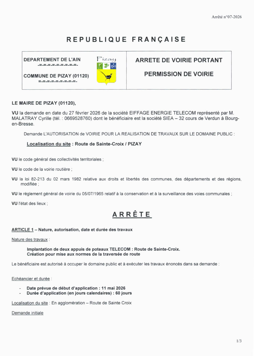 | Arrêté 07-2026 portant sur implantation de deux appuis de poteaux télécom - Route de Ste Croix | Télécharger |